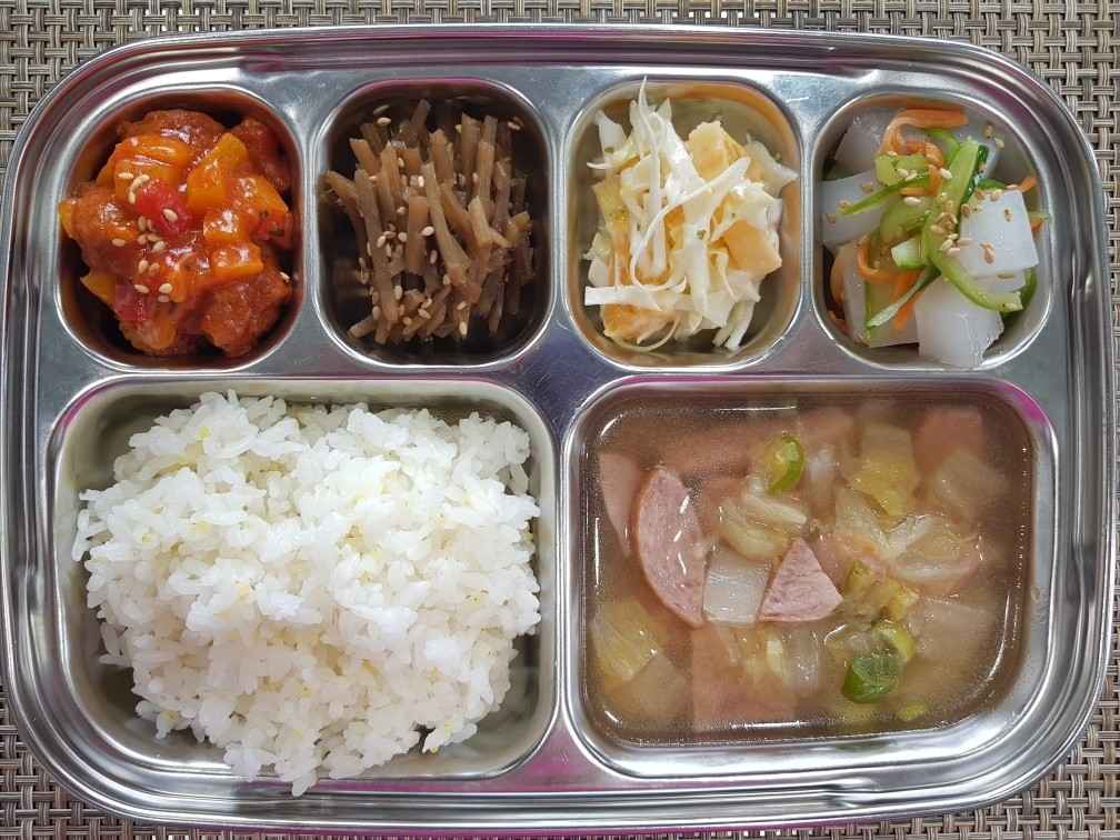 점심 ~ 기장밥, 부대찌개, 미트볼파프리카조림, 청포묵무침, 우엉채볶음, 오렌지양배추샐러드
