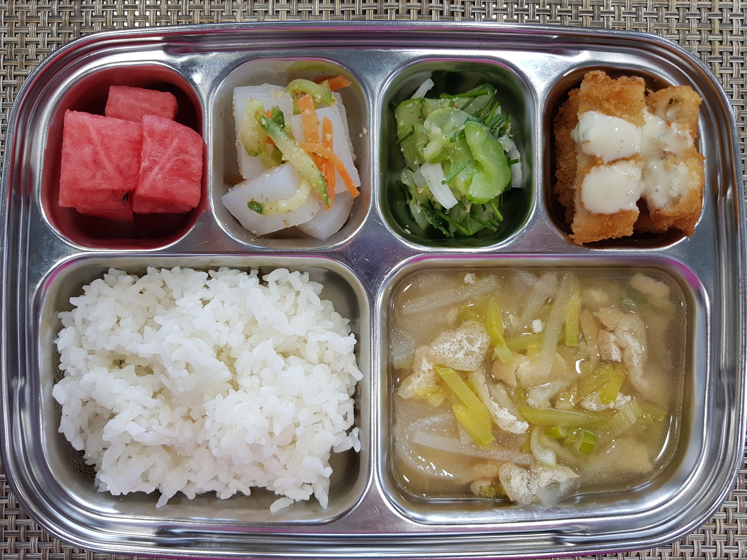 점심~ 흰쌀밥, 유부무채된장국, 생선까스*타르타르소스, 청포묵무침, 수박, 오이초무침