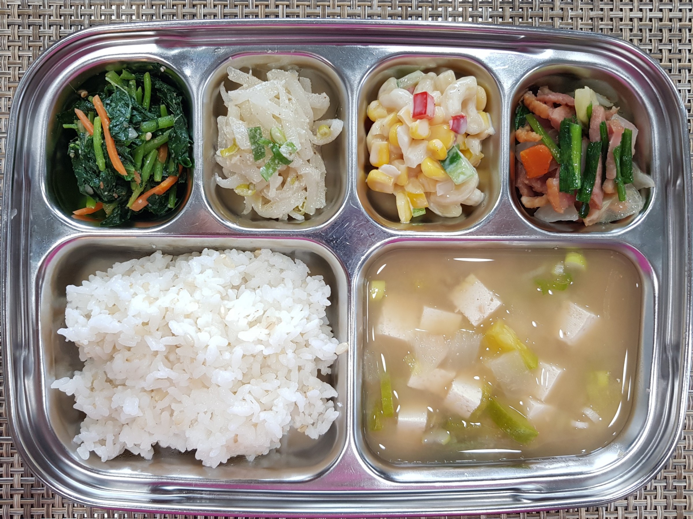 점 심 ~ 현미밥, 청국장, 부추오리훈제구이, 들깨무나물, 참나물무침, 마카로니콘샐러드