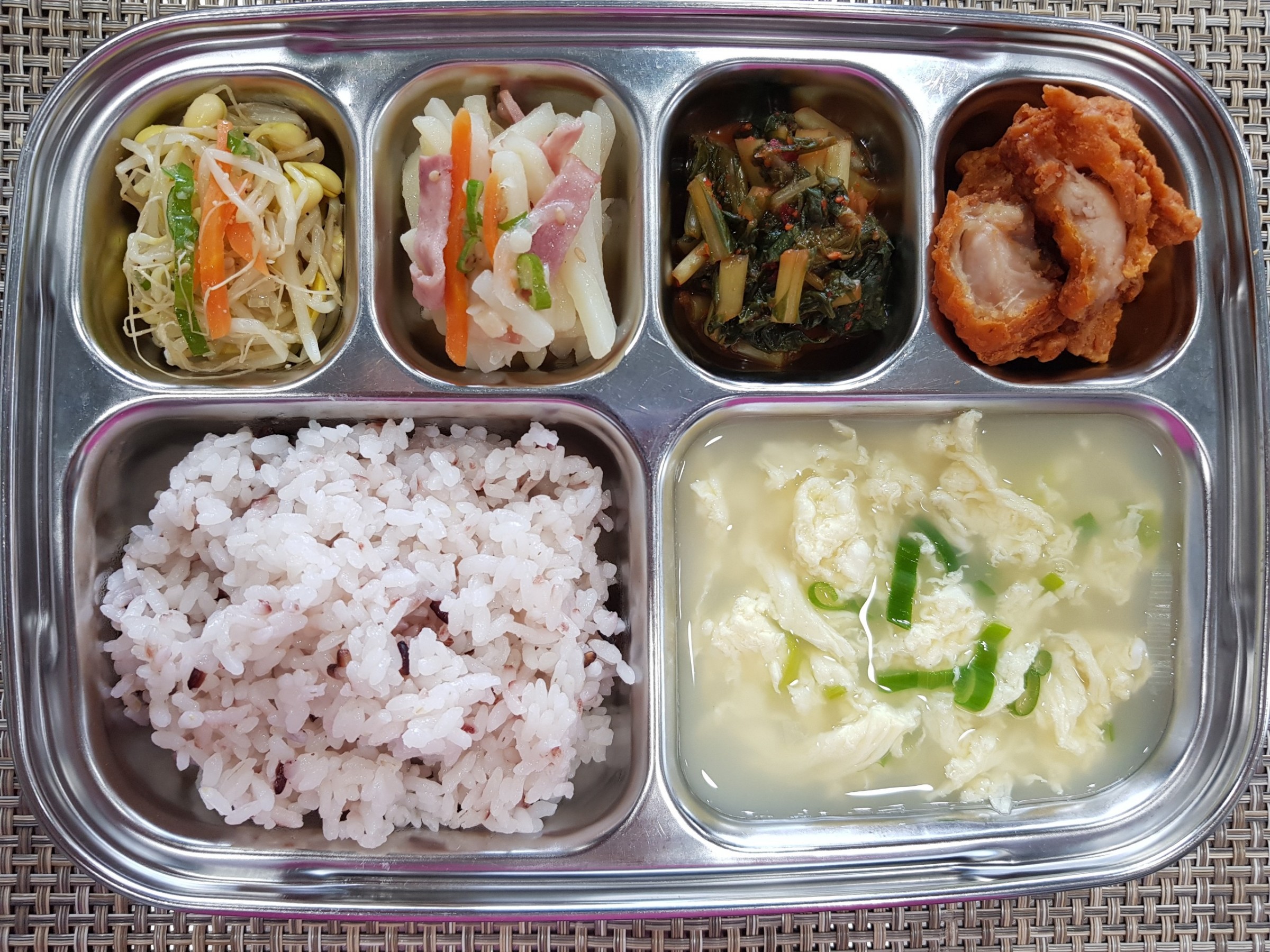 점 심 ~ 흑미밥, 계란파국, 후라이드치킨, 베이컨감자채볶음, 콩나물무침, 열무김치