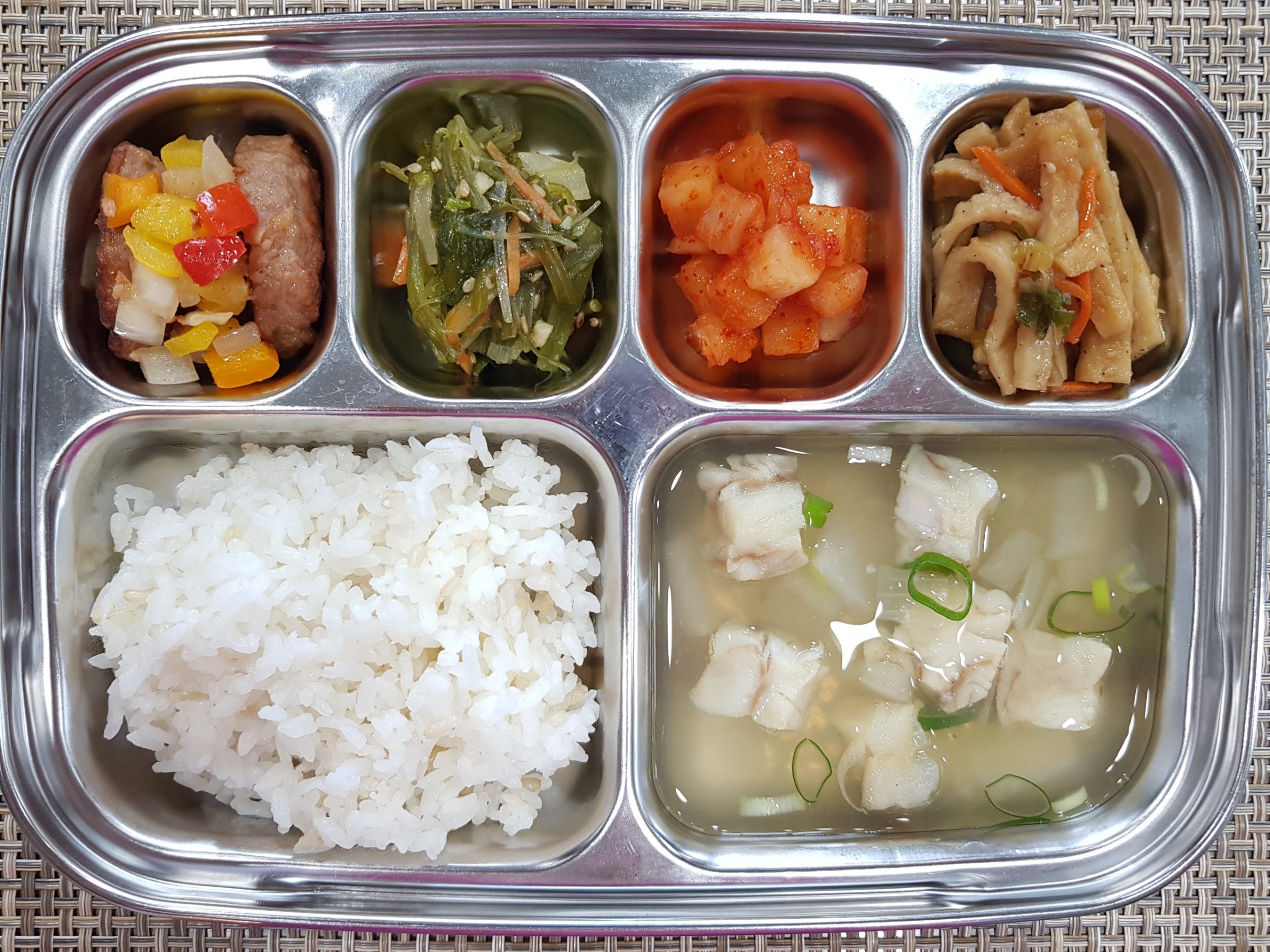 점 심 ~ 현미찹쌀밥, 동태살무국, 파프리카떡갈비찜, 어묵야채볶음, 미역줄기볶음, 홍시깍두기