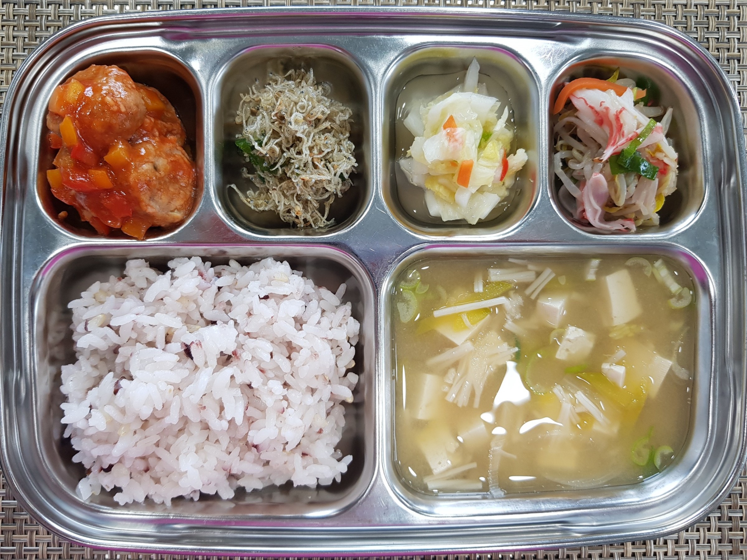 점 심 ~ 흑미밥, 팽이버섯미소된장국, 파프리카미트볼조림, 크래미숙주나물, 잔멸치볶음, 백김치