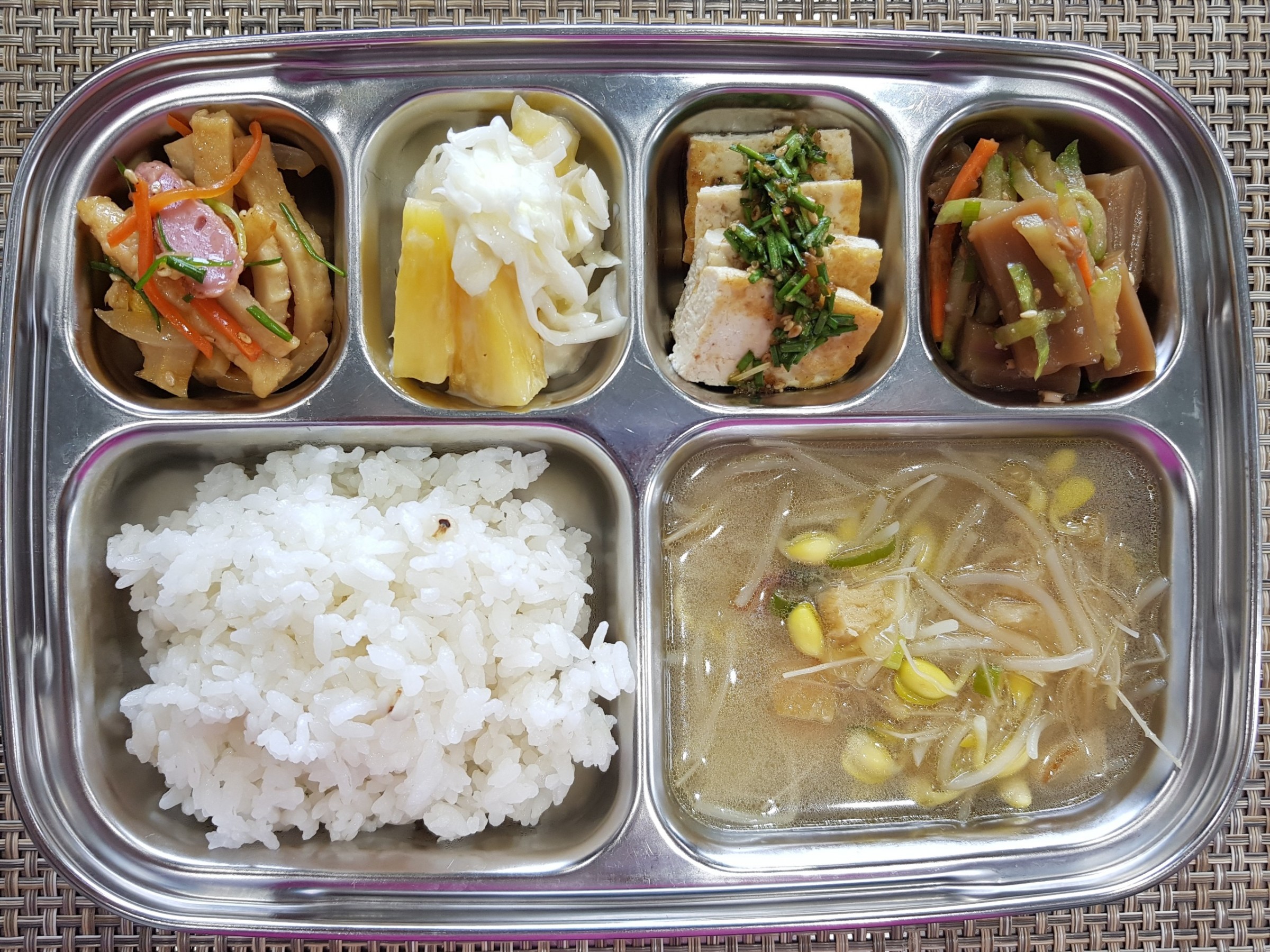 점 심 ~율무밥, 황태콩나물국, 두부구이*양념장, 도토리묵야채무침, 어묵야채볶음, 파인애플양배추샐러드