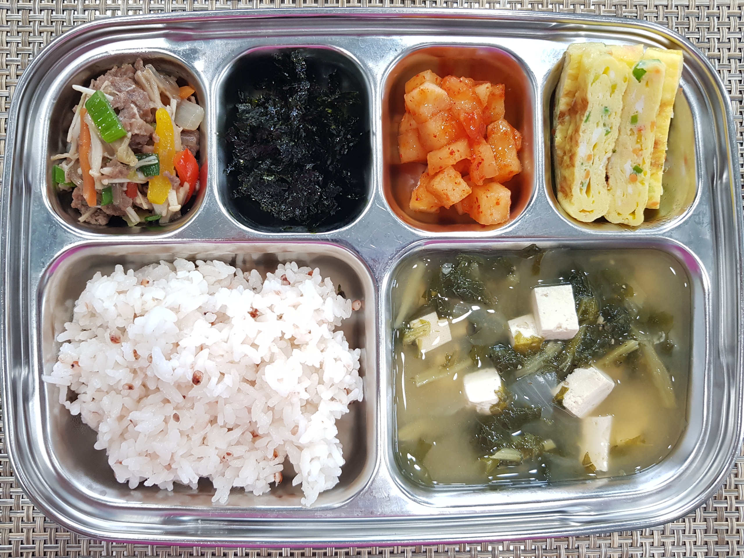 점 심~ 수수밥, 시레기두부된장국, 한우팽이버섯불고기, 야채계란말이, 조미김, 홍시깍두기