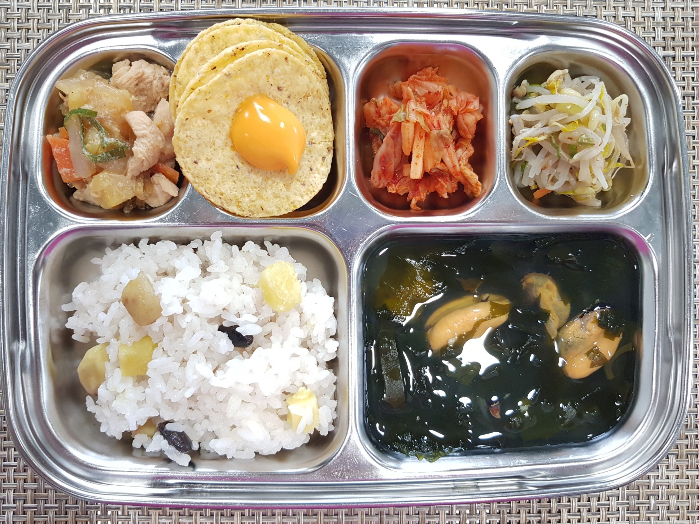 점 심 ~ 영양밥, 홍합미역국, 고구마닭갈비, 숙주나물, 나쵸*치즈, 배추김치