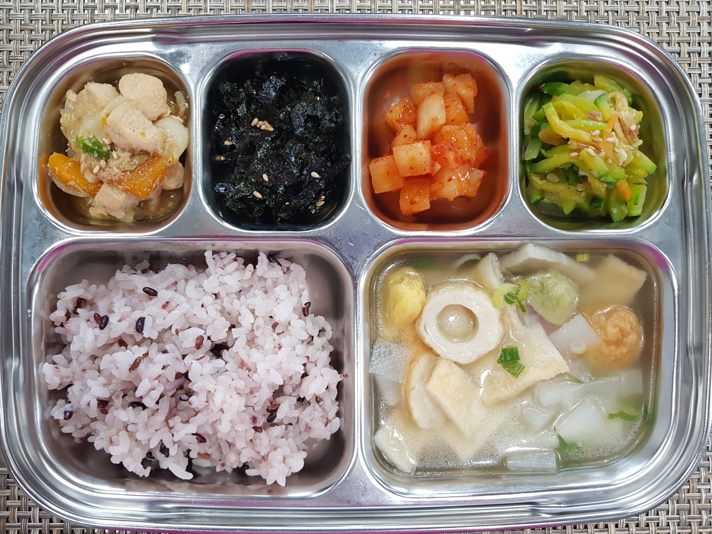 점 심 ~ 흑미밥, 모듬어묵탕, 단호박닭갈비, 건새우애호박볶음, 조미김, 홍시깍두기