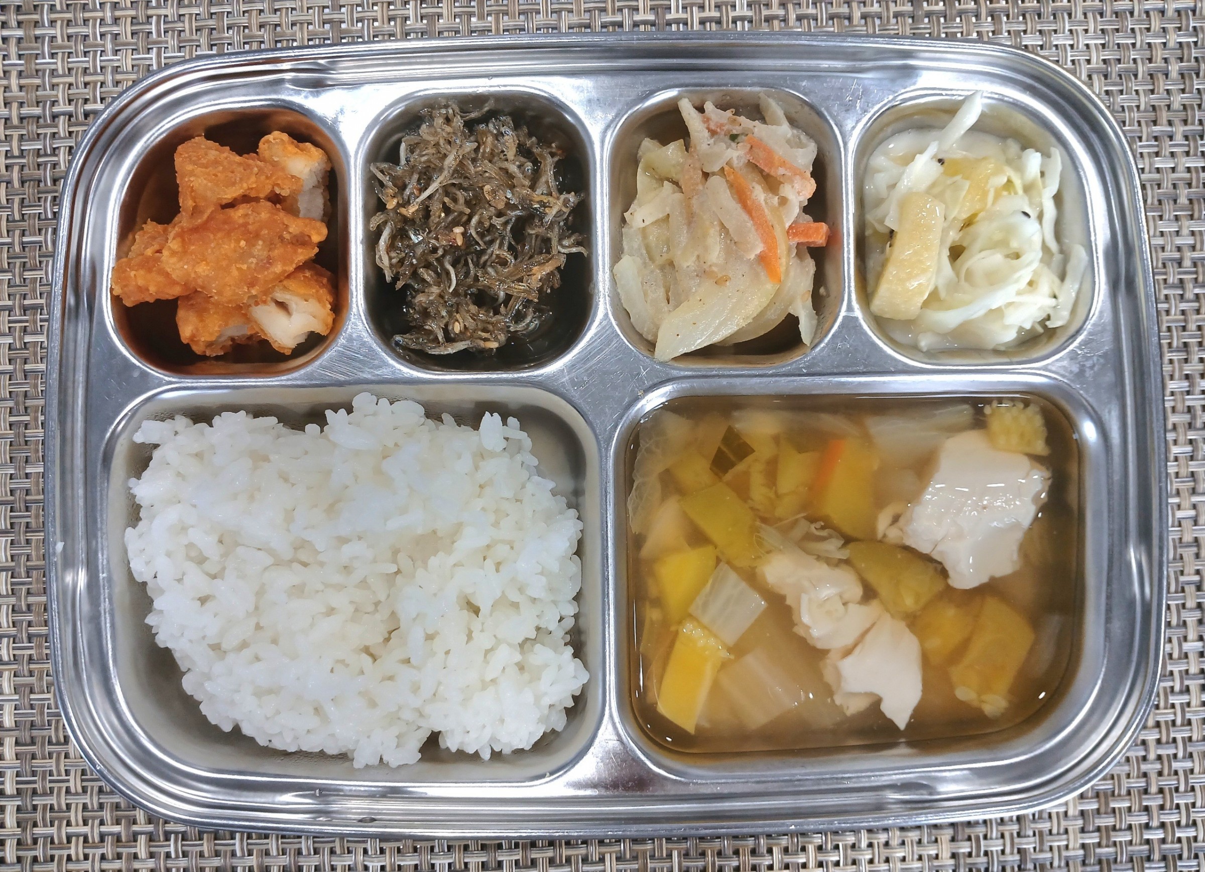 점 심 ~ 흰쌀밥, 애호박순두부찌개, 후라이드치킨, 멸치볶음, 들깨무나물볶음, 골드키위양배추샐러드