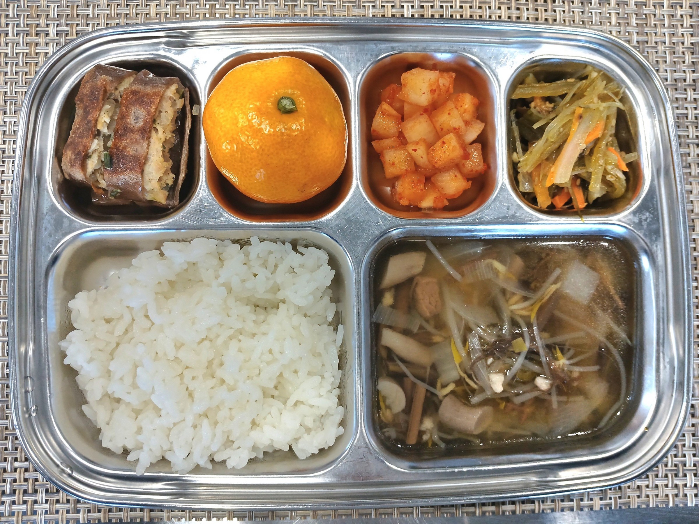 점 심 ~ 흰쌀밥, 소고기육개장, 고기밀전병, 미역줄기볶음, 감 귤, 홍시깍두기