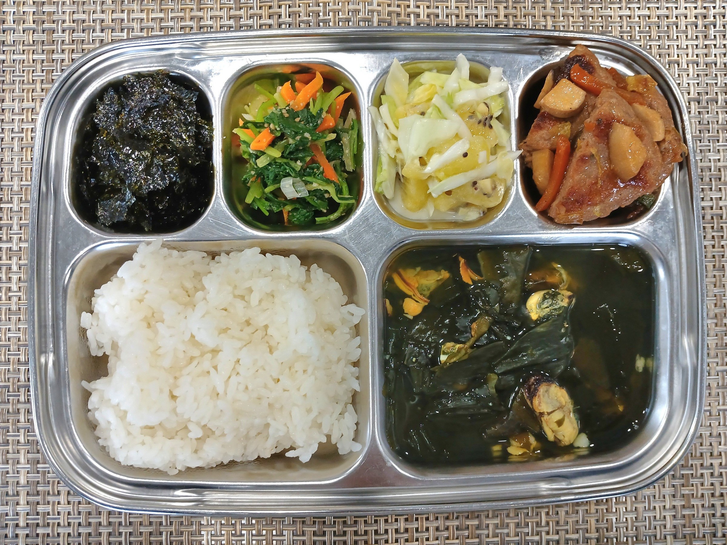 점 심 ~ 흰쌀밥, 홍합미역국, 버섯떡갈비구이, 참나물무침, 조미김, 골드키위양배추샐러드