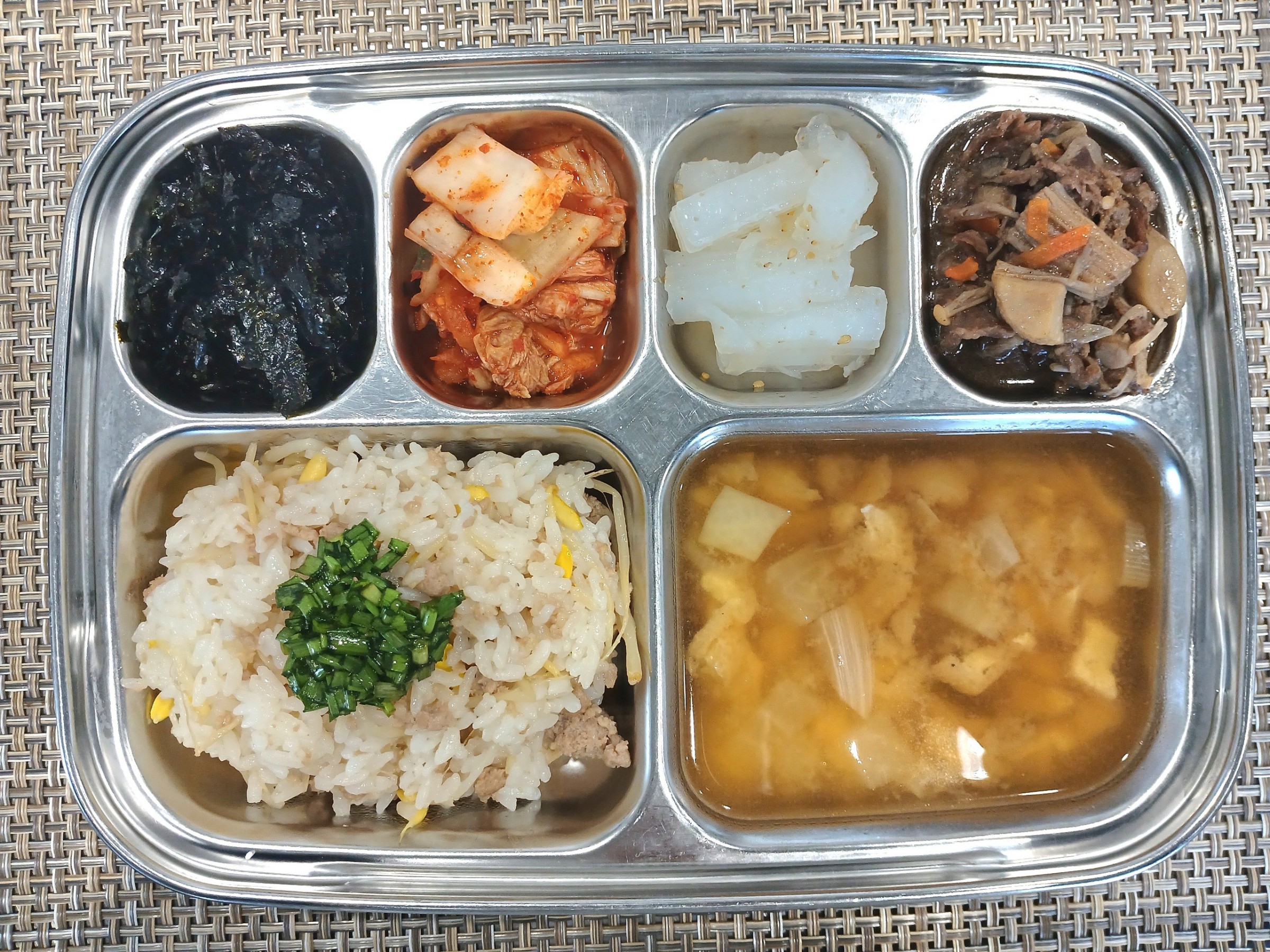 점 심 ~ 콩나물비빔밥*양념장, 유부미소된장국, 소고기버섯전골, 청포묵무침, 조미김, 배추김치