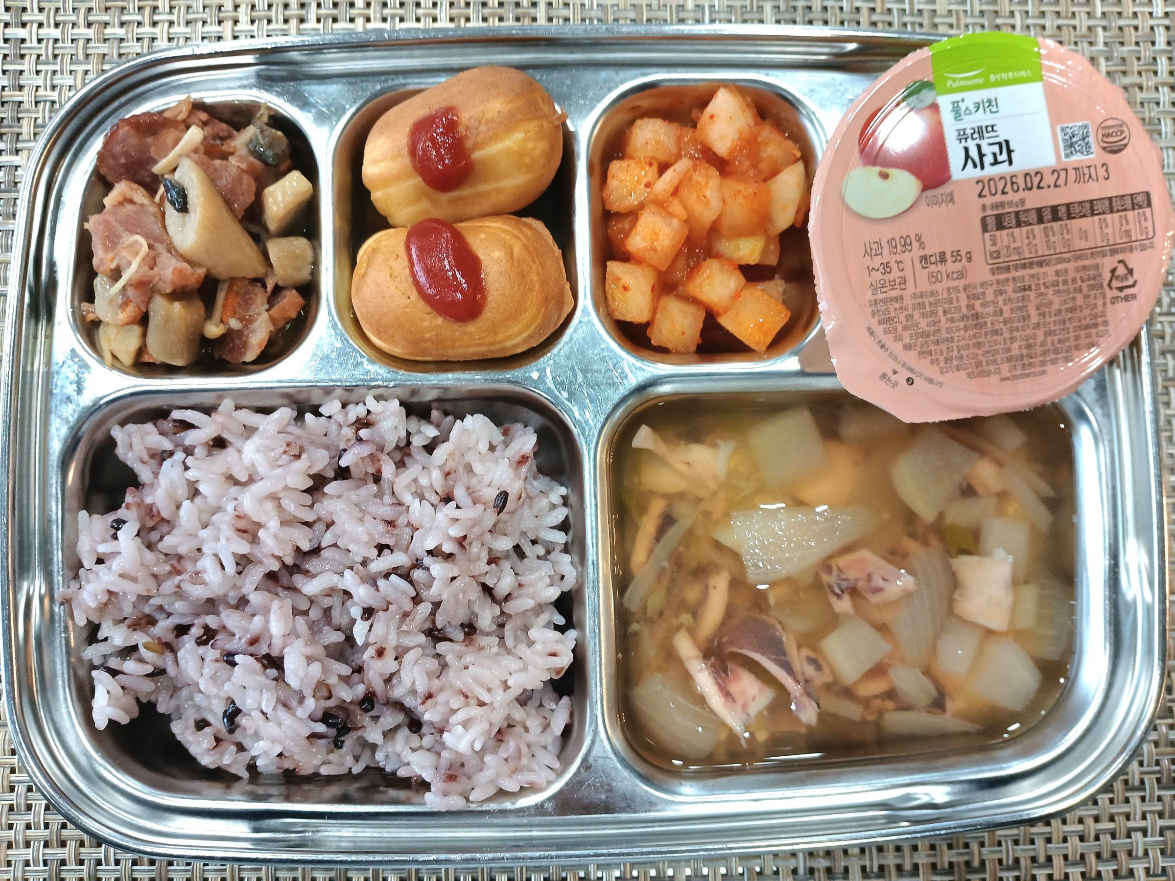 점 심 ~ 흑미밥, 오징어무국, 오리훈제버섯구이, 미니핫도그*케찹, 홍시깍두기, 사과푸딩 **(사과 알러지=포도 푸딩으로 대체 급식)