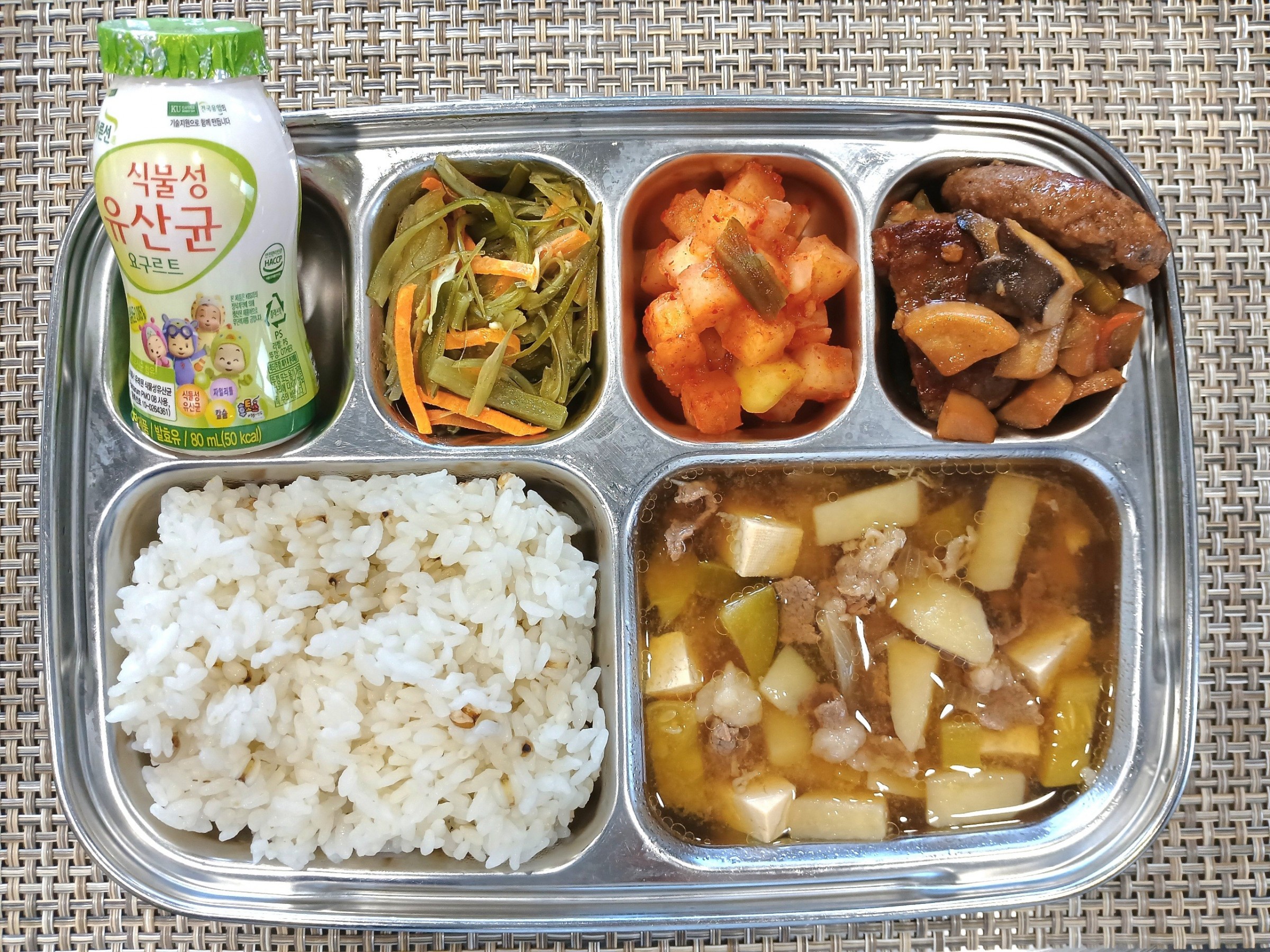 점 심 ~ 율부밥, 차돌된장찌개, 버섯떡갈비구이, 미역줄기볶음, 요구르트, 홍시깍두기