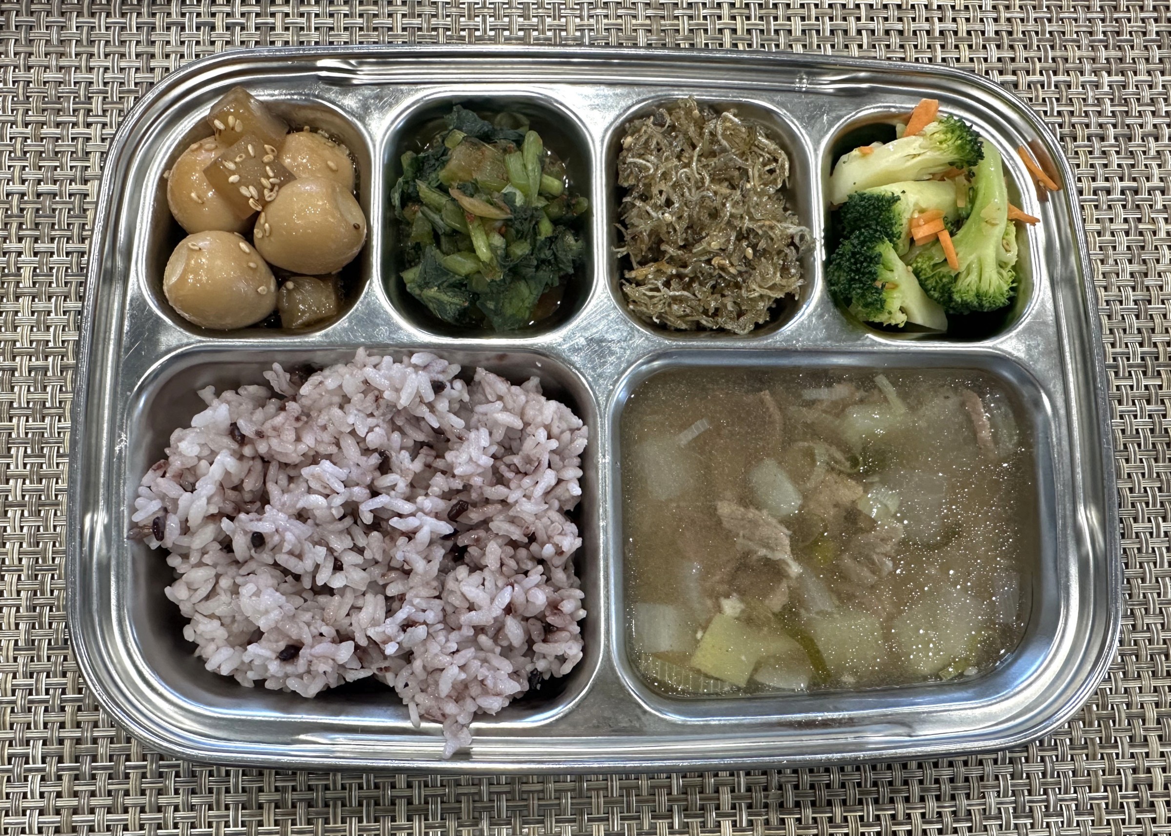 점 심 ~ 흑미밥, 한우소고기무국, 곤약메추리알장조림, 잔멸치볶음, 브로콜리무침, 열무김치