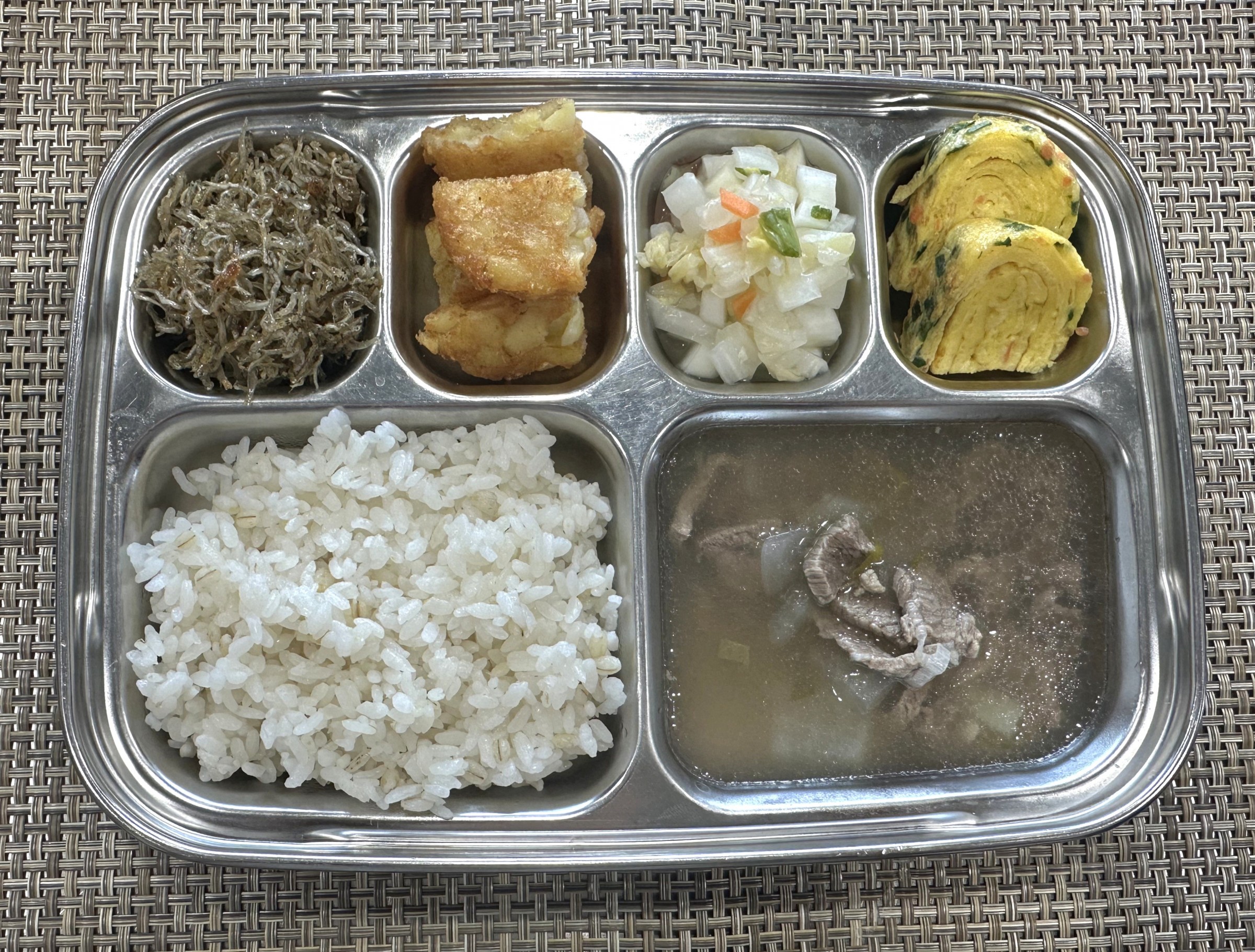 점 심 ~ 현미밥, 한우무국, 영양계란말이, 잔멸치볶음, 해쉬브라운*케찹, 깍두기