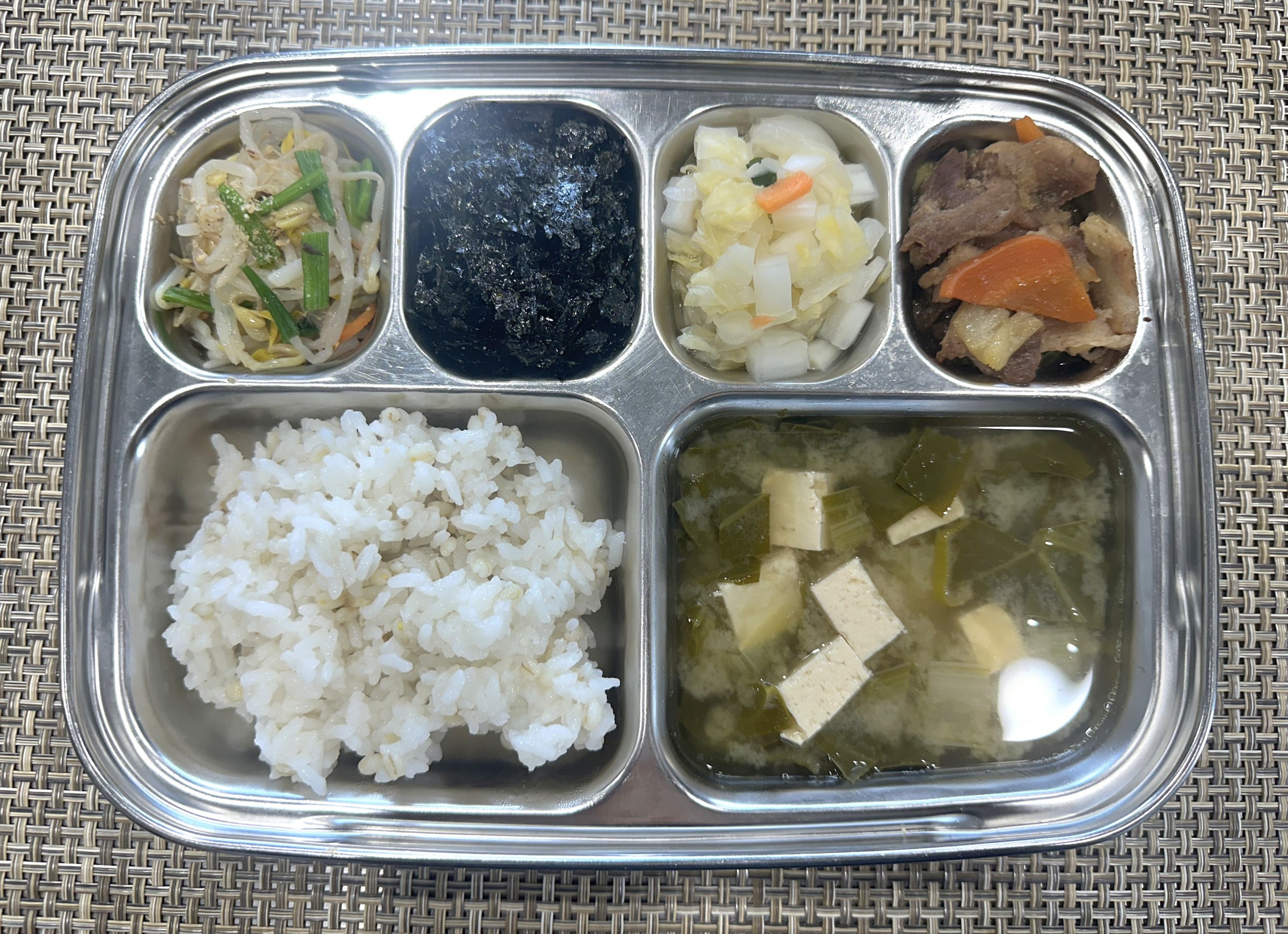 점 심 ~ 보리밥, 근대두부된장국, 돈육야채불고기, 미나리숙주나물, 조미김, 백김치