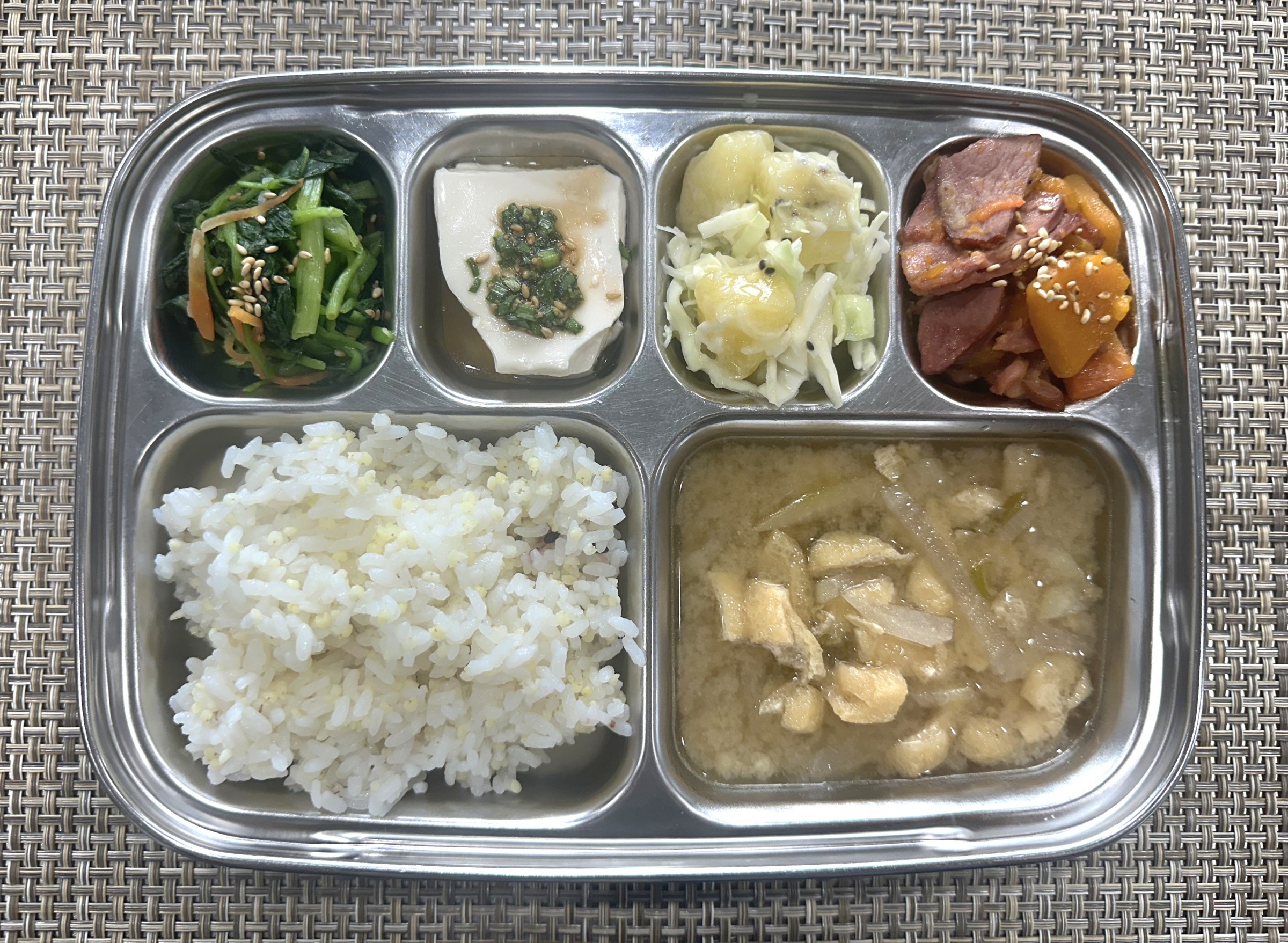 점 심 ~ 기장밥, 유부무채된장국, 단호박오리훈제구이, 연두부*양념장, 참나물무침, 골드키위*양배추샐러드
