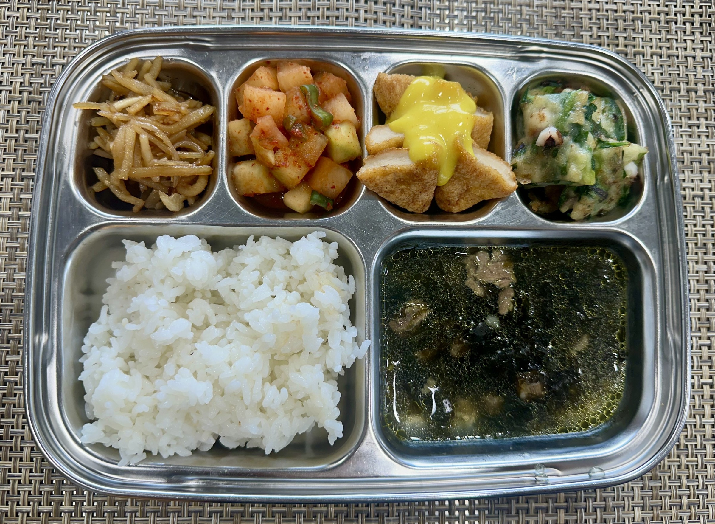 점심 ~ 쌀밥, 소고기미역국, 치킨너겟*허니머스타드, 해물파전, 진미채무침, 미니 깍두기