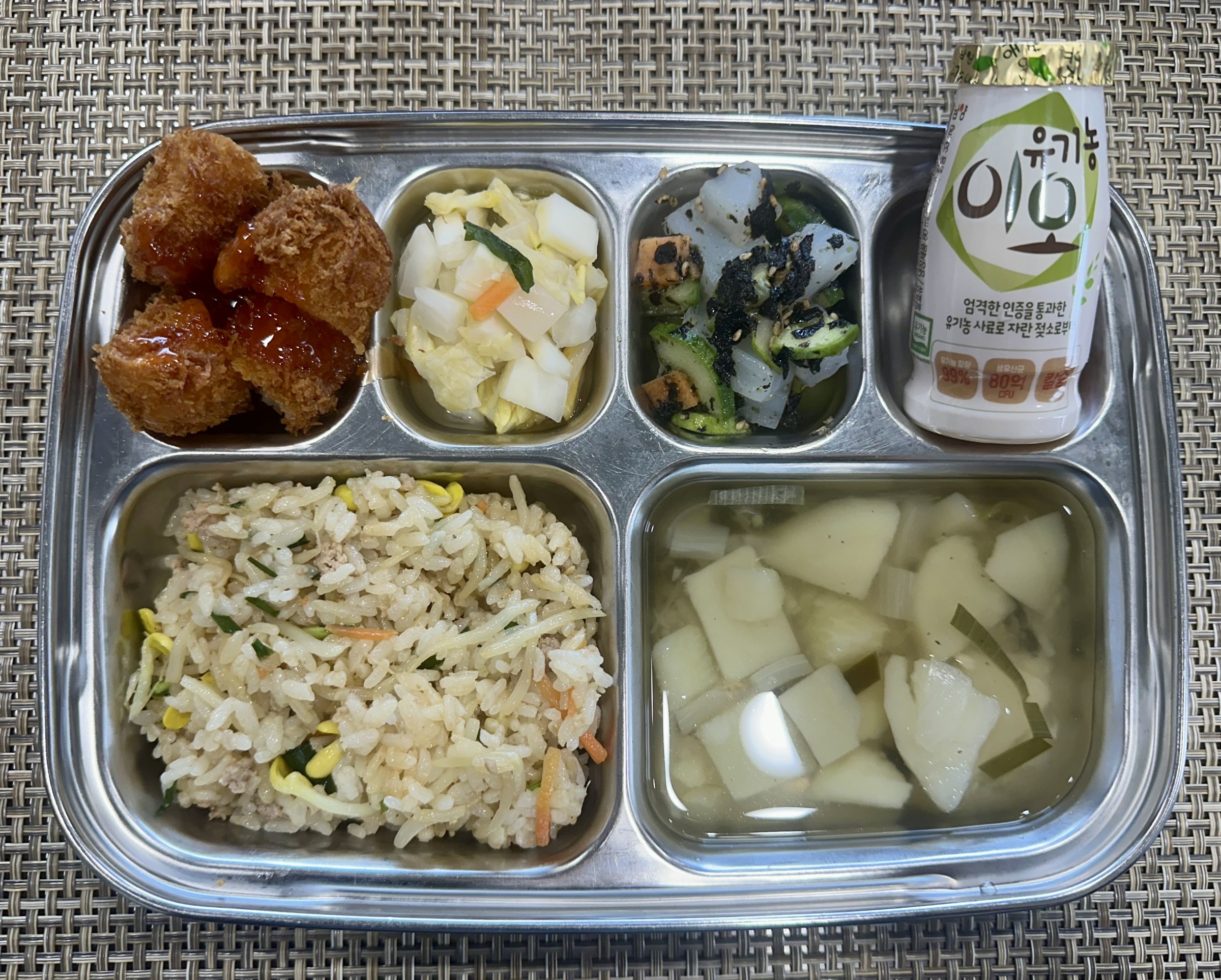 점심 ~ 콩나물비빔밥, 다시마감자국, 왕새우튀김/칠리소스, 청포묵무침, 요구르트, 백김치