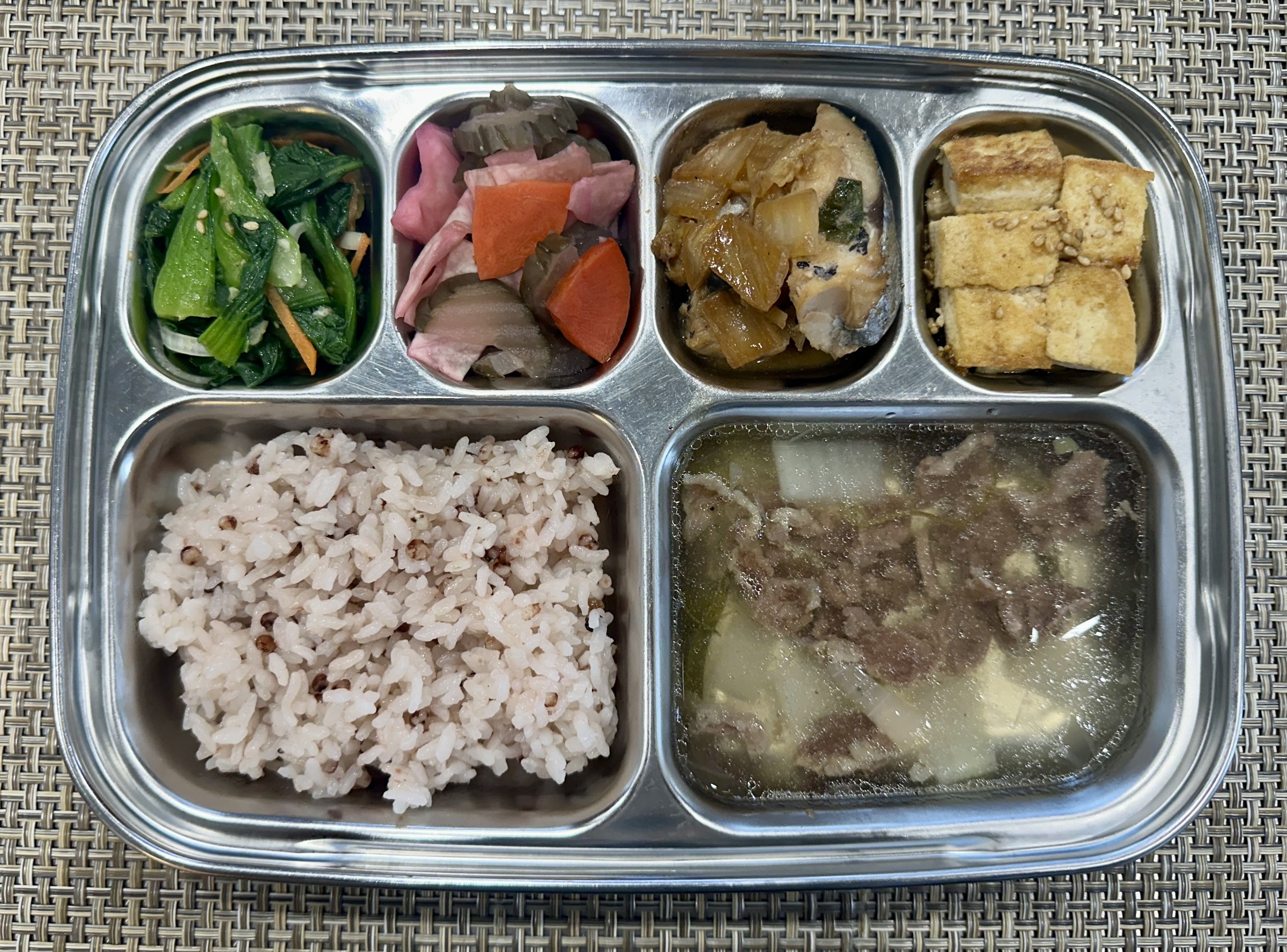 점심 ~ 수수밥, 소고기무국, 순살삼치김치찜, 두부구이*양념장, 청경채나물, 오이피클