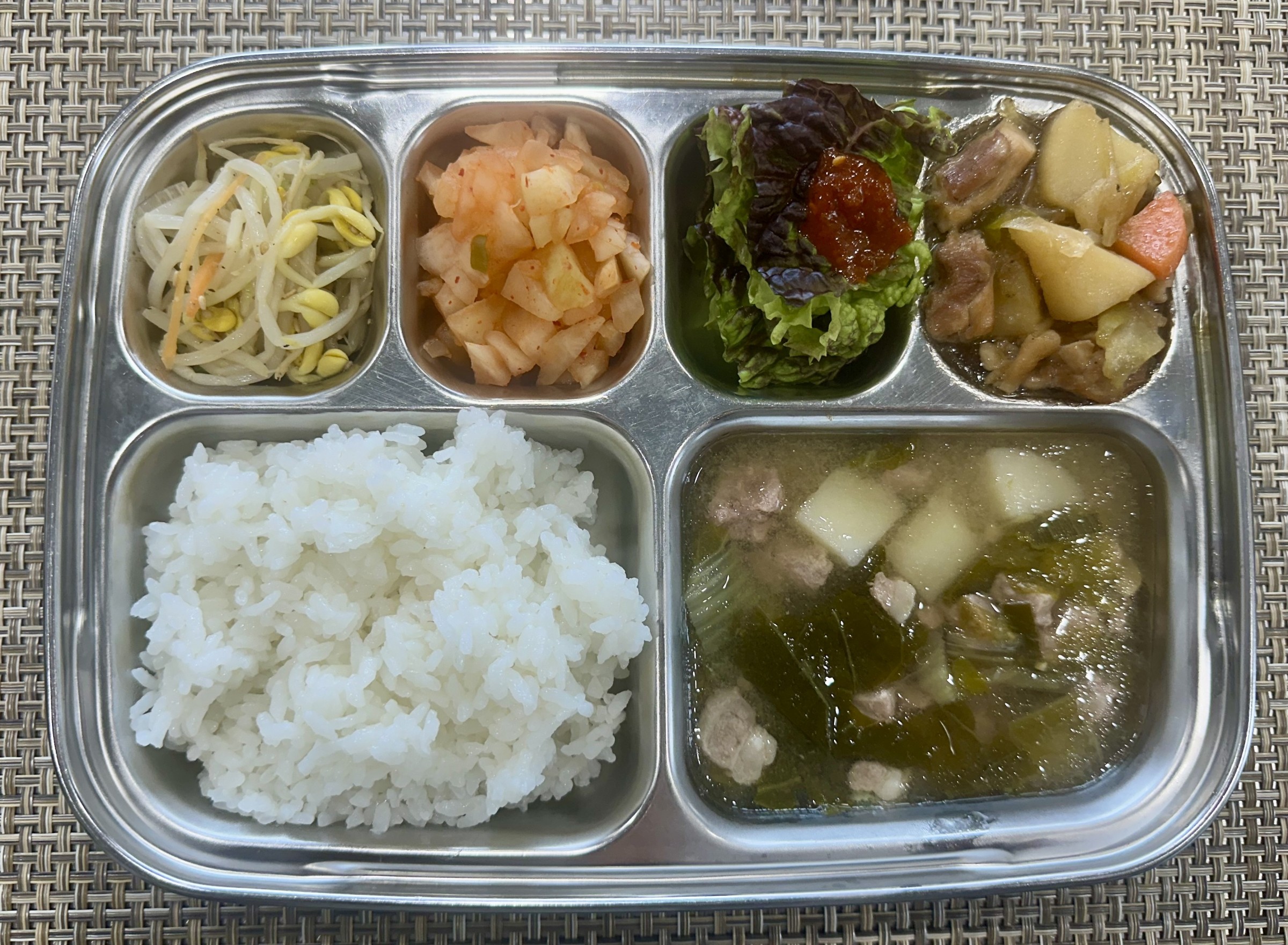 점심 ~ 흰쌀밥, 돈순살감자탕, 안동찜닭, 콩나물무침, 모둠쌈/쌈장, 미니깍두기