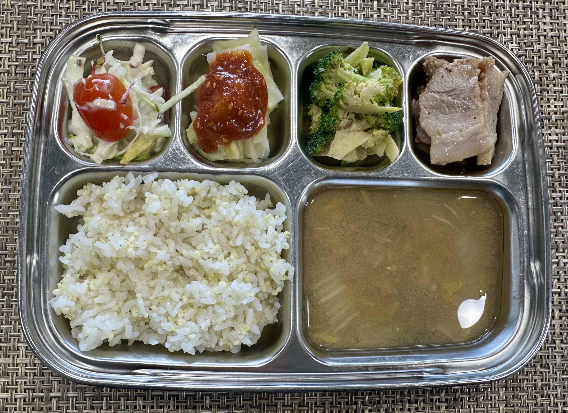 점심 ~ 차조밥, 바지락살배추된장국, 수육, 양배추쌈*쌈장, 브로콜리들깨무침, 방울토마토그린샐러드