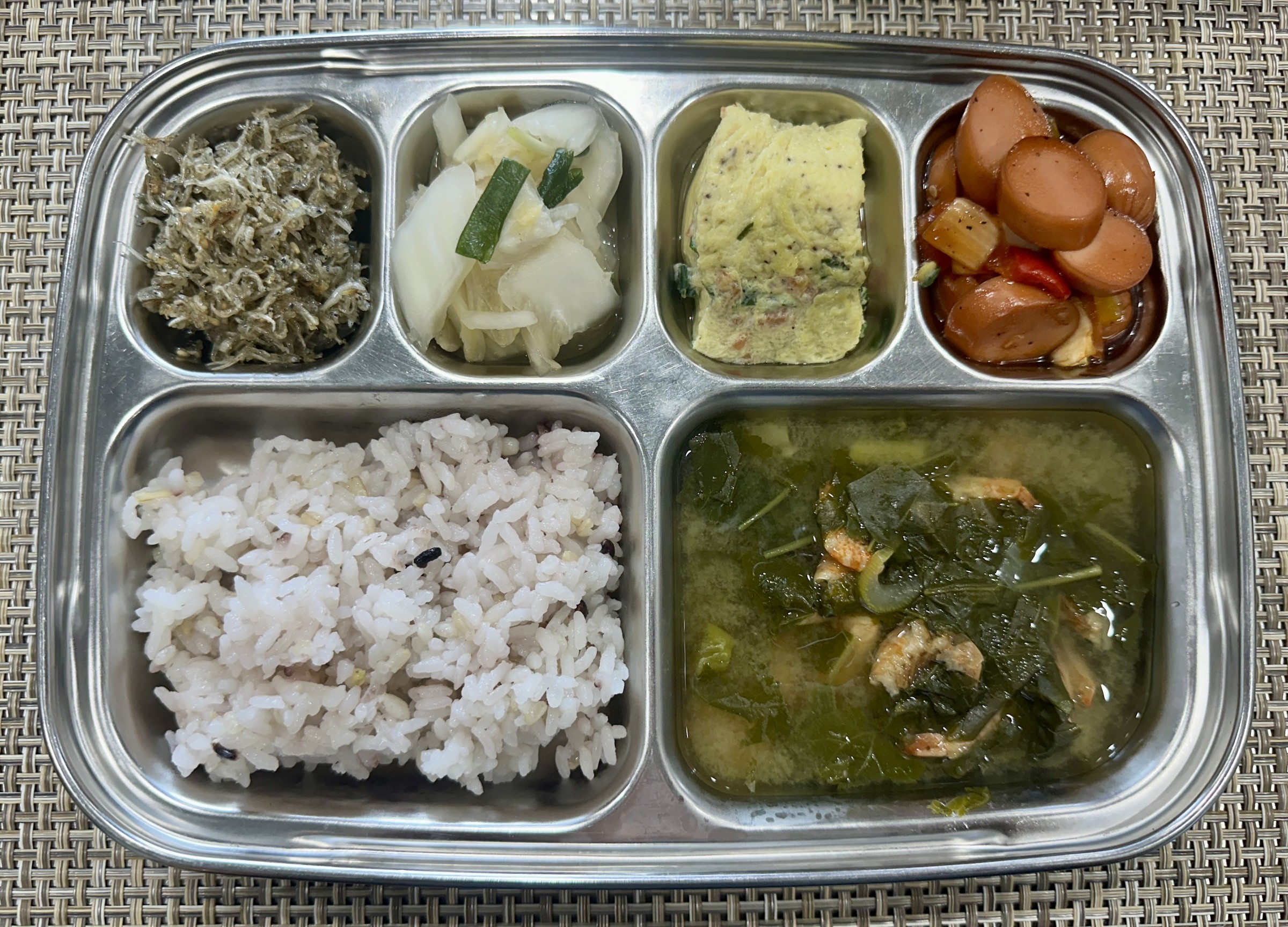 점심 ~ 혼합잡곡밥, 건새우아욱된장국, 야채계란찜, 소세지파프리카볶음, 잔멸치볶음, 백김치