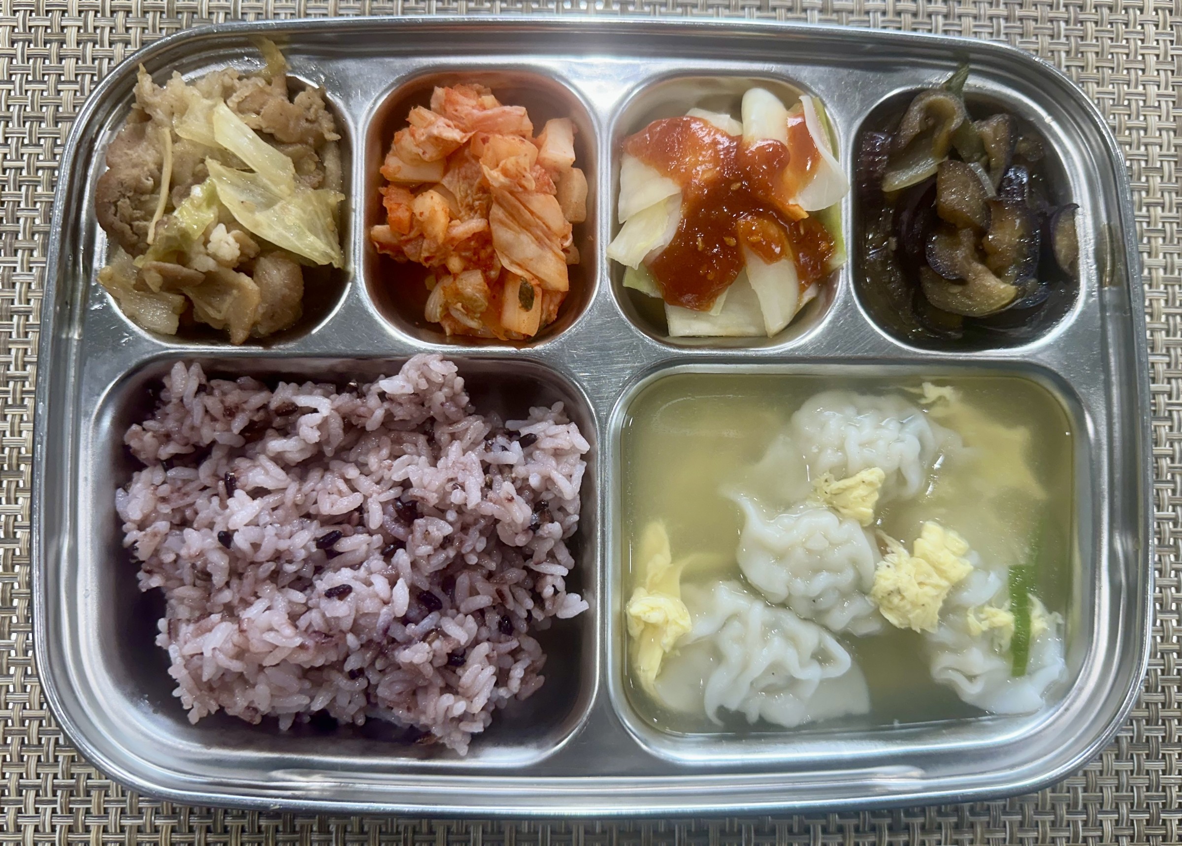 점심 ~ 흑미밥, 계란물만둣국, 팽이버섯제육볶음, 양배추찜*쌈장, 가지볶음, 배추김치